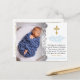 Thank your guests for attending Baptism or Christening of your little baby boy with this modern lovely thank you postcard. Design featuring photo of the baby , floral frame gold cross and your message on the front , gold cross and floral gold frame on the back. Do not hesitate to contact me if you require help with this design.