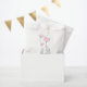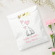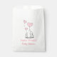 Delicate pink baby girl favour bags for the mum-to-be's baby shower . A hand sketched baby elephant with it's mother help celebrate with pink heart shape balloons they are holding in their trunks. One heart shape pink balloon is sailing away. The name of the mum-to-be, the text "Baby Shower" are set in pink.