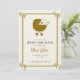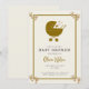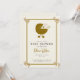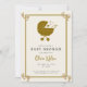 This design features a minimalist and elegant baby shower invitation with a gold-toned baby carriage illustration at its centre. The layout is framed with a warm beige background and accented by adorable baby footprints in the corners. The text highlights the celebrant's name in a stylish script font, paired with clean typography for the event details, making it perfect for celebrating a new arrival with class and charm.