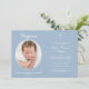 Celebrate your baby’s baptism with this elegant dusty blue invitation — a timeless, faith-filled design that suits girls. The soft blue background pairs beautifully with modern script and a white simple cross, creating a serene, heartfelt layout. A centered oval frame highlights your little one’s photo, while the back features a matching floral pattern for a polished finish. Every line of text is fully editable, allowing you to personalize your child’s name, ceremony details, and favorite scripture. Printed on premium paper, this invitation captures the grace of the occasion and becomes a keepsake that families will treasure for years.