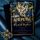 Elegant baroque style dark and moody blue and white floral "SURPRISE" birthday party design. Features dramatically elegant white lily of the valley flowers and dusky blue hawthorn flowers with lush dusky green greenery on a multi-tonal teal to darkest blue background. Add to this the luxury of real gold foil, and you have a birthday celebration that is at once sophisticated and timelessly elegant, but also dramatically modern.