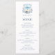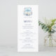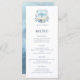 This elegant coastal wedding menu card features a watercolor beach monogram crest with initials of the bride and groom, and the wedding date on the banner of the crest.