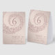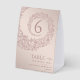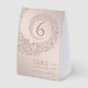 This wedding table number card radiates elegance and charm with a soft beige background paired with lush salmon pink damask accents. The ornate decorative frame is enriched with lace effects, creating a delicate and timeless feel. The central table number stands out clearly, surrounded by the intricate damask and lace-inspired border. The word “Table” is written in graceful calligraphy, adding a refined and romantic detail to the design.