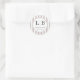 This elegant wedding sticker features a minimalist circular design with alternating beige and white vertical stripes as the background. The central focus is on two large initials separated by a line, accompanied by the phrase "THANK YOU" in a classic serif font, creating a sophisticated and formal look. The soft color palette and clean layout evoke a sense of gratitude and celebration, making it perfect for expressing thanks at your special event. Its timeless style ensures it complements any wedding theme beautifully.