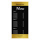 Front: At the top, this elegant rack card has black display text for the restaurant's name on a faux gold stripe. Below that, white text reads 'Menu'. Under Menu, there's white text for your menu items and prices. The faux gold stripe at the bottom has black display text for the address and phone number. Back: There's additional white text for menu items and prices. All text can be edited or deleted. Gold is an artistic rendering (not foil).