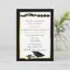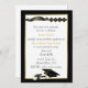 Stylish graduation party invitation, done with a white background and a black and gold tone frame. Graphics of a black and gold banner, across the top, and a diploma and mortarboard cap, on the bottom. Personalise the year and rest of the invitation's text to suit your party needs.