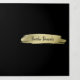 Modern trifold brochure featuring an abstract gold paint stroke and your name in an elegant brush script over a black background. The back panel has your hours of operation and contact information. The inner fold panel has two headers and text boxes. The inside has multiple templates for information about your business on the outer panels and a price list in the middle panel. Both sides have folding guides which may be removed by clicking the "customise" button. A simple trifold brochure with a feminine touch, perfect for a woman owned nail salon, beauty salon or hair stylist.