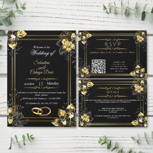 Elegant black and gold summer wedding invitation