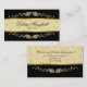 Elegant business card, with a solid black background, with a stripe of golden yellow floral pattern, on both the front and back of the card. A decorative gold tone stripe separates the background colours. Graphics of a tan rose flourish decorates the black portion of the backgrounds. Black text is ready to personalise, with your information.