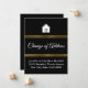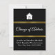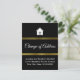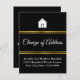 Do you need to make a moving announcement? This card is black and faux gold with white text and you can customise the card with your name and new address. At the top there's a house. At the bottom there's custom white text for your name and new address. In the middle is a black background for your custom text (shown: 'Change of Address'). Gold look is an artistic rendering (no foil).