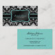 Elegant and Modern Black and White vintage damask pattern with teal blue and balck ribbon. Professional Business cards for all business type. Especially designed for Salons and Spas. Add your own custom text.