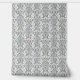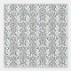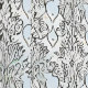 This intricate black and white floral design features a repeating pattern of delicate flowers and vines, set against a soft, light blue background. The symmetrical layout gives it a vintage, art nouveau feel.
