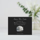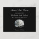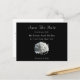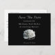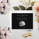 This Elegant Wedding Black and Whie Save the Date Post Card showcases a charming Black Background, with a White Roses and Pearls Wedding Bouquet element. The contemporary calligraphy adds a touch of elegance to the overall esthetic.