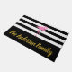 Let your visitors know they've reached the right home. You can add your family's name in faux gold script on the wide black stripe at the bottom. The background is black and white stripes. A pink flamingo is above the text.