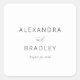 This wedding sticker features a minimalist design with a clean, white background and elegant typography. The layout includes bold serif fonts for the names, complemented by a flowing cursive script for "and," creating a sophisticated yet modern look. The ample negative space enhances readability and focus, making it perfect for a chic and contemporary wedding celebration. Its simple colour palette of black text on white emphasises clarity and timelessness, ideal for couples seeking an understated yet stylish aesthetic.