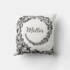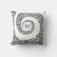 This decorative pillow design features a sophisticated black damask swirl pattern set against a crisp white background. The ornate frame spirals towards the centre, where a circular damask wreath encloses an editable monogram initial. Its timeless black-and-white palette gives it a classic yet versatile appeal, perfect for adding elegance to living rooms, bedrooms, or as a personalised gift for weddings, anniversaries, and housewarmings.
