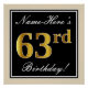 This simple and elegant birthday party poster design features a personalised message like "Name-Here’s 63rd Birthday!" (with the "63rd" having a faux/imitation gold-like colouring look) within a black-coloured square area featuring a simple border outline. The name is in an elegant white-coloured script-like text, and can be customised. A personalised birthday party poster like this could perhaps be used as a decoration at a party being held for somebody who is celebrating their sixty third birthday. [~Z0000236]
