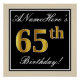 This simple and elegant birthday party poster design features a personalised message like "ANameHere’s 65th Birthday!" (with the "65th" having a faux/imitation gold-like colouring look) within a black-coloured square area featuring a simple border outline. The name is in an elegant white-coloured script-like text, and can be customised. A personalised birthday party poster like this could perhaps be used as a decoration at a party being held for somebody who is celebrating their sixty fifth birthday. [~Z0000236]