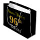 This simple, elegant birthday gift bag design features a personalised message like "Name-Here’s 96th Birthday!" (with the "96th" having a faux/imitation gold-like colouring look) on a black coloured background. The name is in script-like, yellow-coloured text, and can be customised. A personalised birthday gift bag like this could perhaps be used when giving a present or gift to somebody who is celebrating their ninety sixth birthday. [~Z0000258]