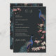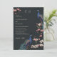 This Elegant Black Floral Peacock Wedding Invitation features hand-drawn blue and teal peacocks perched on Magnolia branches in full bloom in black ink against a modern black background. The back features a pattern of these same elements. Personalise with your wedding details by clicking on "Personalise this template" on the product page. All text is editable.