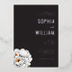This elegant wedding invitation features a sophisticated black background with crisp white text, creating a striking contrast. The design includes delicate illustrations of peonies in the bottom left corner, adding a touch of natural beauty and softness to the overall look. Classic serif typography enhances the formal and refined aesthetic, while ample negative space ensures clarity and focus on the essential details. Perfect for couples seeking a timeless and minimalist style, this invitation sets the tone for an unforgettable celebration.
