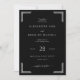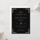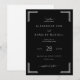 This elegant wedding invitation features a sophisticated black background with crisp white text, creating a striking contrast. The design showcases a balanced and symmetrical layout with ornate borders framing each corner, adding a touch of refinement. A mix of cursive and serif fonts highlights the names and event details, while decorative geometric patterns enhance the classic aesthetic. Perfect for formal celebrations, this invitation exudes elegance and tradition, setting the tone for a memorable occasion.