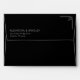 This elegant wedding envelope features a minimalist design with a solid black background and crisp white text. The layout is clean, with the names and address presented in a modern sans-serif font, creating a sophisticated look. An abstract geometric motif adds a touch of artistic flair to the right side, balancing the composition beautifully. The monochromatic colour palette enhances the timeless appeal, making it perfect for formal occasions.