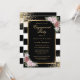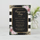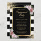 Elegant black and white striped engagement party invitation featuring blush pink flowers framing the event details inside a gold frame adorned with gold confetti. Matching items available. Blush floral engagement party invitation. Black and gold engagement party invitation.