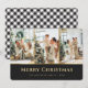 Elegant black and gold buffalo plaid photo Christmas cards featuring a photo collage on the front and a black and green buffalo plaid pattern background at the back. Easily personalise these photo Christmas cards with your images and text.