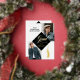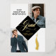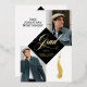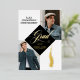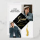 Black gold grad cap tassel photo Graduation Announcement and party invitation designed with a timeless, elegant aesthetic that highlights your grad's milestone in an elegant classic style. The front features a graceful, flowing calligraphy “Grad” script paired with a grad cap and hanging tassel. Two photo spaces, allowing you to showcase your graduates’ portraits with sophistication. An varsity stye text complemented by the graduation year and a personalized school name, creating a polished, cohesive look. The back features a black grad cap and tassel with "Grad Party designed within the grad cap with a section in the middle for the grad party details. Perfect for high school seniors, college graduates, and university celebrations, this announcement is ideal for families who love modern elegance with a classic, blending simplicity, personalization, and timeless style in one beautiful keepsake. Design by Moodthology Papery.