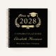 Elegant black and gold graduation party guest book featuring "Class of" in an illustration of laurel wreath incorporating a grad cap and diploma, the graduate's name in a formal script, and "Congratulations" and their school name in classic serif typography.