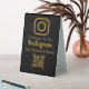 Boost your business's social media presence with this elegant gold Instagram QR code table tent sign. Featuring a sleek black background and shimmering gold accents, this sign is designed to effortlessly attract customers. The iconic Instagram logo is prominently displayed, encouraging engagement, alongside a clear call to action: "Follow Us On Instagram." Your business name can be easily added, making it a unique extension of your brand. A scannable QR code links directly to your Instagram profile, simplifying the connection for your clientele. Perfect for cafes, boutiques, salons, and any establishment looking to expand their online reach.
