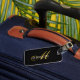 A simple stylish monogram luggage tag with a gold script initial over your name in white sans serif type. Contact information on the back.