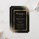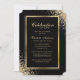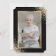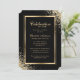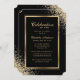 Elegant black and gold celebration of life invitation featuring event details inside a gold frame adorned with gold glitter on the front and a photo inside a gold frame at the back.