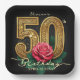 Elevate your milestone celebration with this stunning paper plate. Featuring an elaborate, ornate gold number "50" paired with a romantic single red rose against a dramatic black background, this design radiates sophistication and glamour. It is the perfect choice for a woman's 50th birthday party, adding a luxurious touch to your cake, appetizer, or buffet table. The typography features an elegant gold script that is easily updated with the guest of honor's name and the specific party date, making it a truly bespoke keepsake for a fabulous fiftieth celebration.