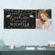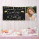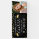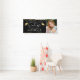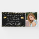Modern graduation banner featuring an elegant handwritten script typography title CONGRATULATION TO OUR GRADUATE, faux metallic gold foil graduation caps or mortarboards, gold glitter confetti and string lights and your graduate's photo, name and class year against an editable black background colour you can easily change to a school colour, party theme colour or favourite colour by clicking CUSTOMIZE FURTHER in the PERSONALIZE section. ASSISTANCE: For help with design modification/personalisation, colour change, transferring the design to another product or if you would like coordinating items, contact the designer BEFORE ORDERING via the Zazzle Chat MESSAGE tab or email at makeitaboutyoustore@gmail.com.