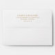 This wedding envelope features a sophisticated and minimalist design with a clean, centered layout. The gold lettering on a white background creates an elegant contrast, highlighting the names and address in a classic serif font. Perfect for formal occasions, this design exudes simplicity and refinement, making it ideal for weddings or other special events where understated elegance is desired.