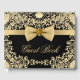 Black and gold guest book with gold jewel bow on an elegant black and gold swirl background. You can easily customise this beautiful black and gold guest book for your event by simply adding the text of your choice in the font style you prefer. This is a printed design with no real bows, jewels, etc.