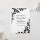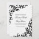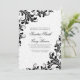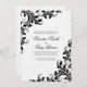Elegant black floral lace swirls over white floral damasks pattern, wedding invitation.