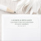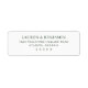 This return address label features a clean, minimalist design with centred text on a white background. The classic serif font adds an elegant touch, while the black and white colour palette creates a timeless look. Perfect for formal occasions, this label offers customisable fields for names and addresses, ensuring a personalised yet sophisticated appearance. Its simple composition emphasises clarity and refinement, making it ideal for weddings or other special events.