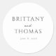 This Classic Round Sticker features a minimalist and elegant design with a clean white background, perfect for formal announcements. The typography combines bold serif fonts with a delicate cursive script, creating a harmonious blend of classic and contemporary styles. The monochromatic black text emphasizes clarity and sophistication, making it ideal for weddings or significant life events. Its simple yet impactful layout conveys a mood of elegance and anticipation, ensuring your message is both clear and refined.