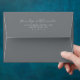 This wedding envelope features a minimalist and elegant design with a sophisticated black background and crisp white text. The layout is centred, creating a balanced and symmetrical appearance that highlights the names in an elegant cursive script at the top, followed by neatly aligned address details in a clean sans-serif font. The modern style emphasises clarity and simplicity, making it perfect for couples seeking a refined and timeless look for their special day.