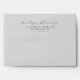 This wedding envelope features a minimalist design with centered text on a clean white background. The names are elegantly displayed in flowing cursive script, while the address is presented in a structured serif font, creating a balanced and sophisticated look. The monochromatic color palette of black text on white enhances its timeless appeal. Perfect for formal invitations, this design exudes elegance and simplicity, making it ideal for couples seeking a classic yet modern aesthetic.