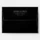 This elegant wedding envelope features a sleek, minimalist design with centred text on a solid black background. The clean, modern typography in white creates a striking contrast, emphasising clarity and sophistication. Perfect for formal occasions, the layout is simple yet refined, making it ideal for weddings or official correspondence. Its contemporary style ensures a polished look that complements any event.