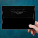This elegant wedding envelope features a minimalist design with a solid black background and crisp white text. The layout is clean and modern, showcasing customizable placeholder text in a sleek sans-serif font that conveys sophistication and formality. Perfect for weddings, the design emphasizes clarity and simplicity, making it ideal for those who appreciate understated elegance. The ample negative space around the text ensures an uncluttered appearance, enhancing its refined aesthetic.