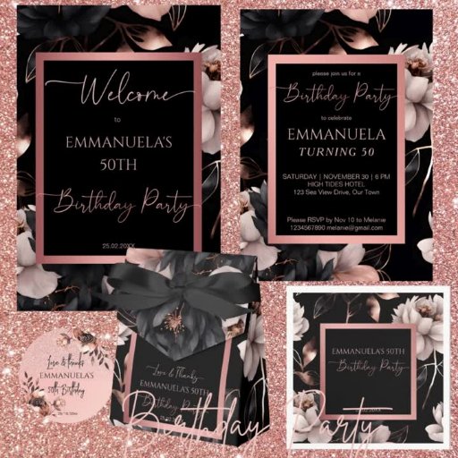 Elegant black rose gold floral birthday party template napkins, black rose gold watercolor peonies black background birthday tableware personalised napkins