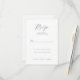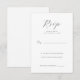 This elegant wedding RSVP card features a minimalist design with ample negative space, creating a clean and sophisticated look. The monochromatic color palette of black text on a white background enhances its formal aesthetic. The typography is the focal point, with an elaborate cursive script for "RSVP" and simple serif fonts for clear instructions and response options. Customizable fields allow for personalization, making it perfect for conveying formality and anticipation for your special event.