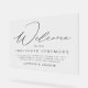 Simple and modern unplugged wedding sign featuring "Welcome" displayed in a modern black calligraphy script with a transparent acrylic background. Personalise the acrylic unplugged wedding sign by adding a custom message and your names. The black and white unplugged ceremony sign was designed to coordinate with our Modern Elegance wedding collection and is available in other colours.