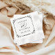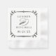 A decorative black scroll frame with ornate corner flourishes showcases the couple's monogram names and date in a refined mix of serif and calligraphy script on these elegant wedding napkins. The timeless black and white design makes a versatile accent for any wedding reception, cocktail hour, or rehearsal dinner.