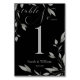 A black and silver script with soft undulating eucalyptus leaves elegant wedding and event table number card that can be customised with any table number. The graphics appear on both sides of this card.